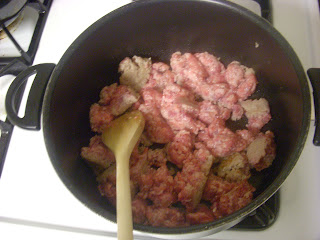 One cold wintry night, Schmambs was trying to figure out what to make for dinner. "You haven't made your Zuppa Toscana in a while.", I stated. She replied, "Well that's cause it's been too hot. Now's the time for it." So it was decided. By the time I arrived after work, Schmambs had already started browning the sausage.